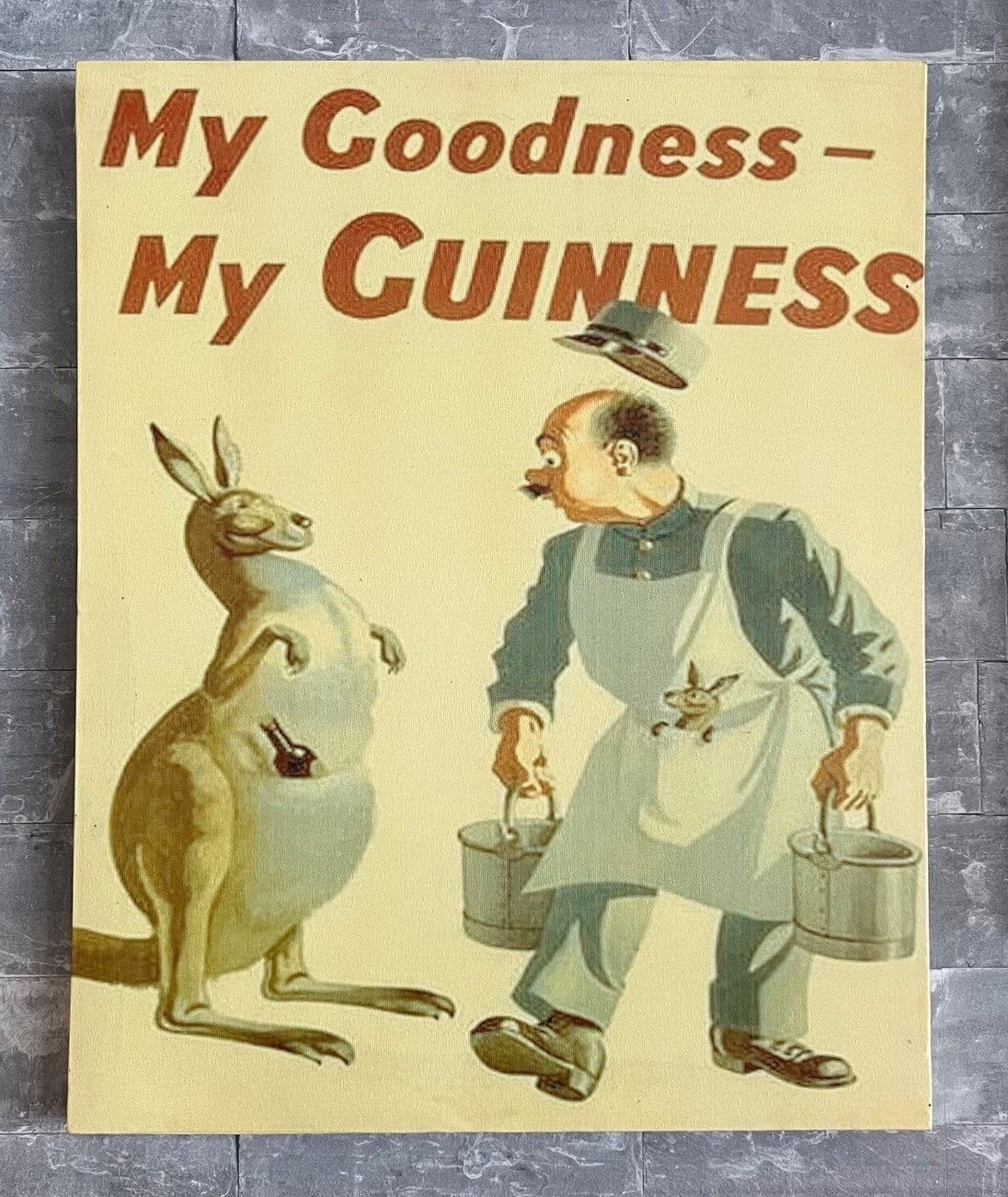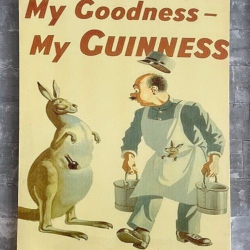 Doek gespannen op hout met vintage Guinness-advertentie, oorspronkelijk ontworpen door John Gilroy. Kenmerkend is de humoristische illustratie met dieren of karakters in grappige situaties.