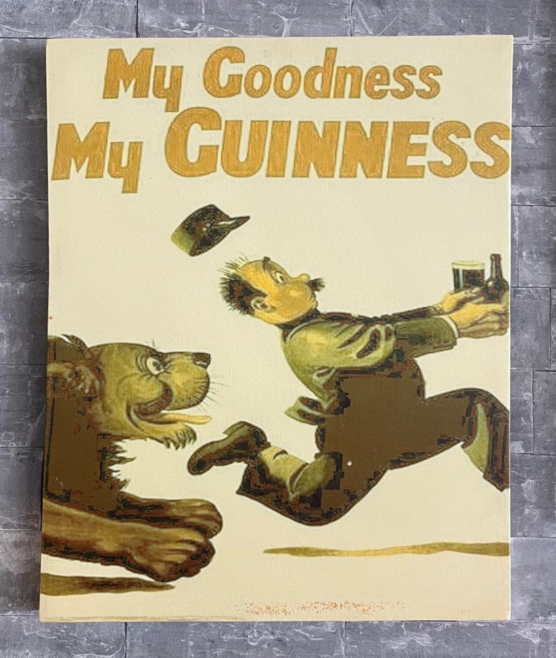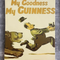 Doek gespannen op hout met vintage Guinness-advertentie, oorspronkelijk ontworpen door John Gilroy. Kenmerkend is de humoristische illustratie met dieren of karakters in grappige situaties.