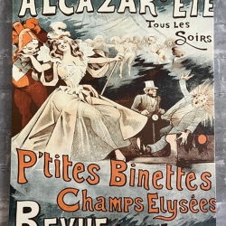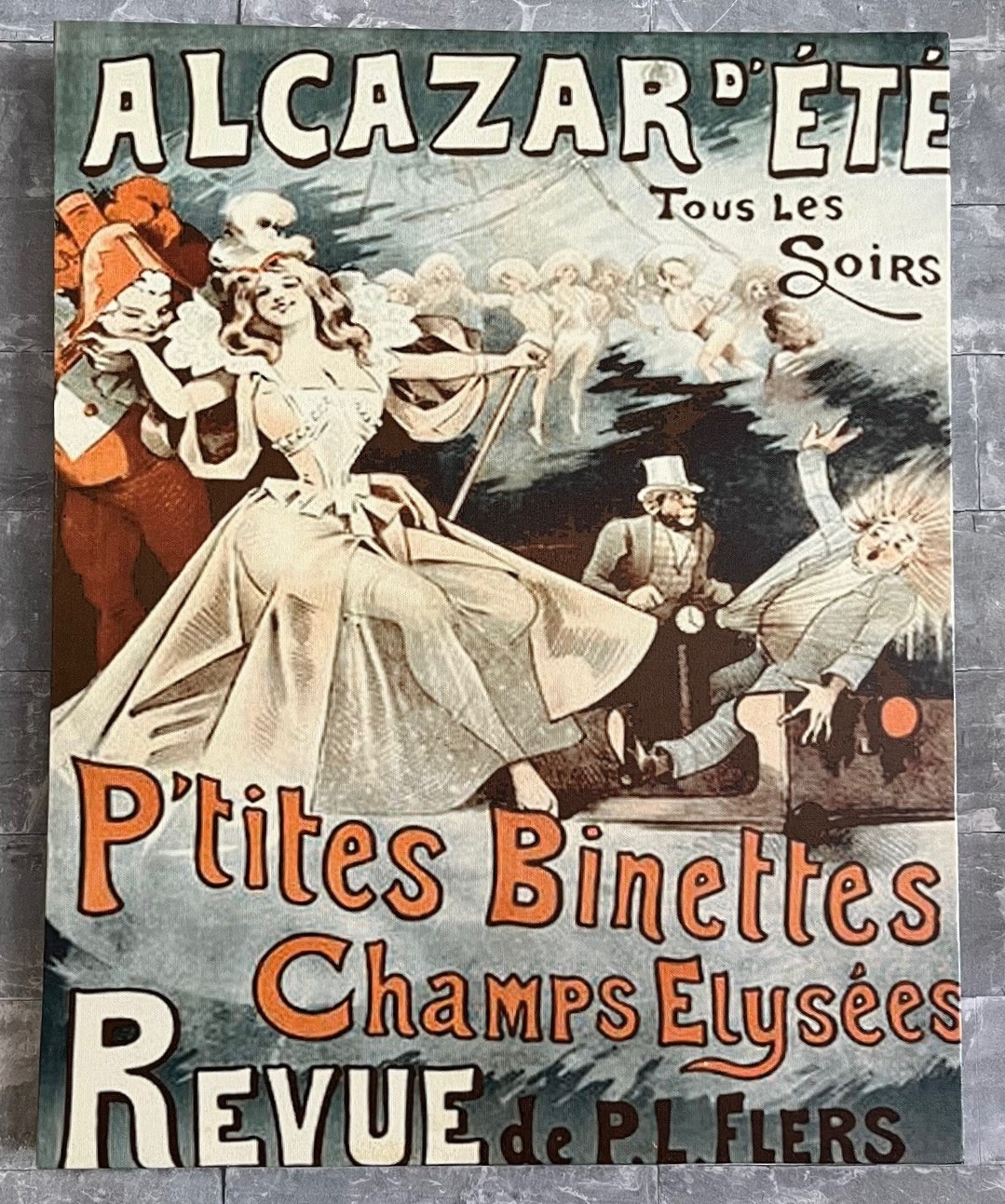 Gespannen doek met een vintage Franse advertentie over een revue (show) voor het Parijse café-concert Alcazar d'Été"